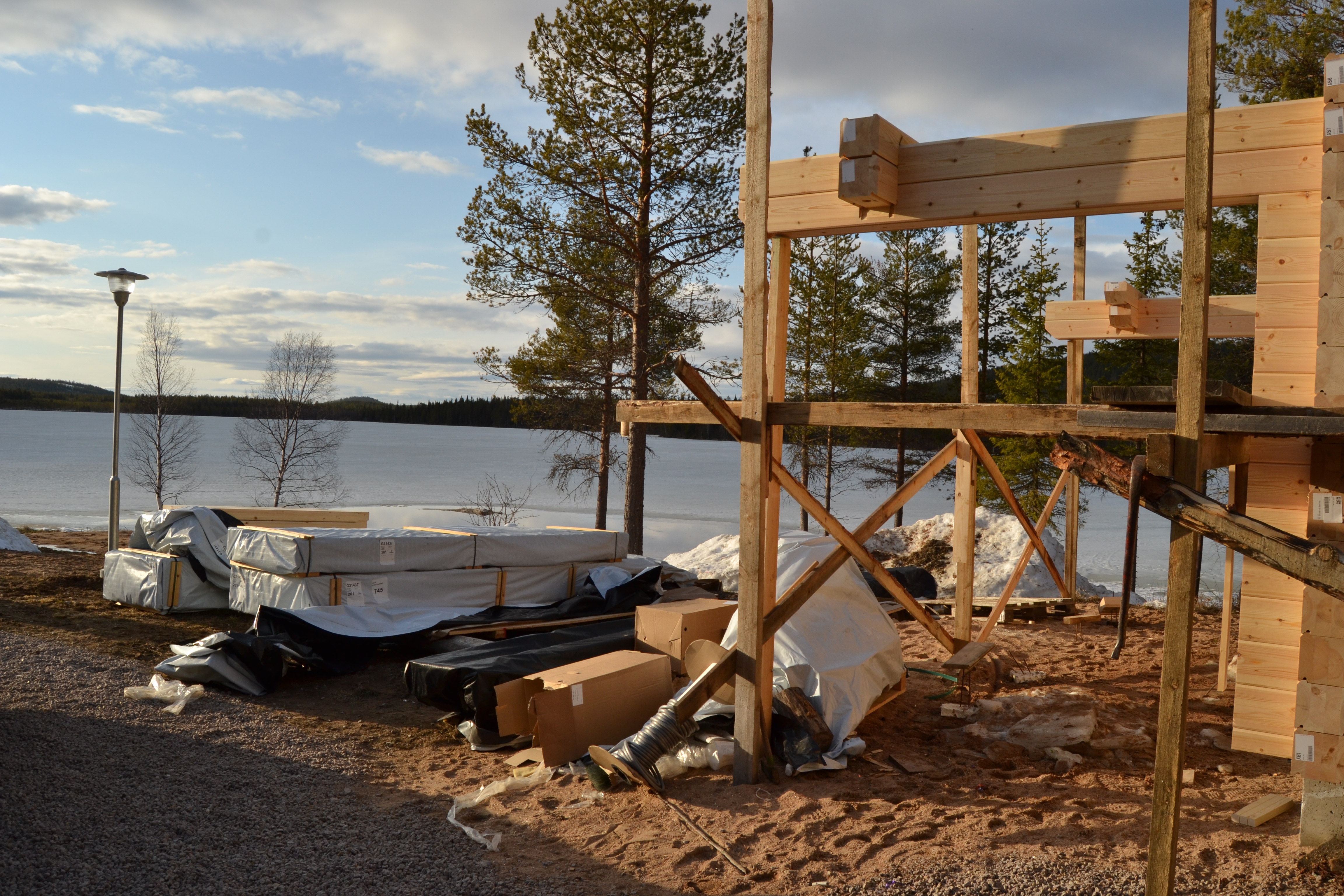 Welcome to visit the Mäntyjärvi construction site! We have started building the new sauna next to the bigger cabin. It has been predicted that the sauna is ready until the end of June. After that you can come and visit. Right next to the sauna there will be a beach. Yours truly did not know that beaches can be made, but here they simply spread a large amount of sand on ice and when the ice melts and the sand sinks… there’s a beach! How brilliant!